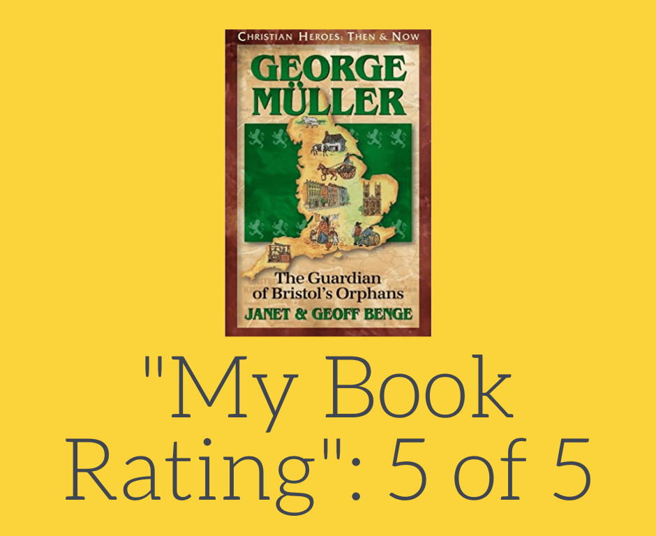 (George Muller The Guardian Of Bristol’s Orphans is in the same series as “Amy Carmichael Rescuer of Precious Gems” and “Jim Elliot One Great Purpose“. The series is titled Christian Heroes: Then and Now.) This book in my opinion also deserves a 5 out of 5 rating, because it is excellently written. I think that it is amazing the depth of faith and trust that George Muller trusted God. This book is written in a way that kids ages 09-12 should be able to read and understand. Also, on the page after the table of contents there is a map of where George Muller did his work for the Lord. I hope you enjoy George Muller The Guardian of Bristol’s Orphans. One thing that I think could have been better is the Geoff and Janet Benge could have added some more details. Over all, I think this book was amazing.